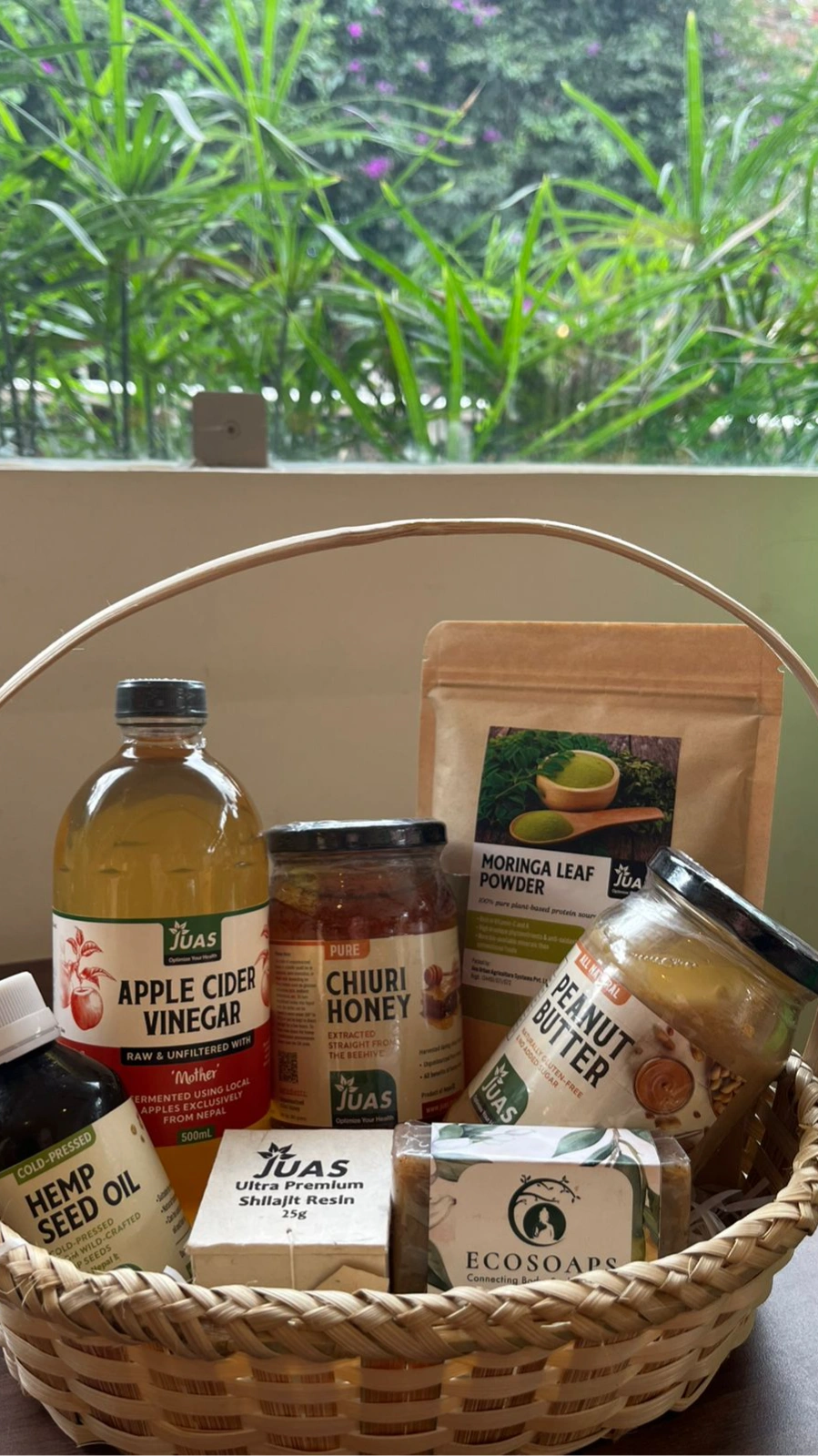 JUAS Moringa leaf powder, Chiuri Honey, Apple cider vinegar, Peanut butter, Hemp seed oil and organic soap in a gift basket.