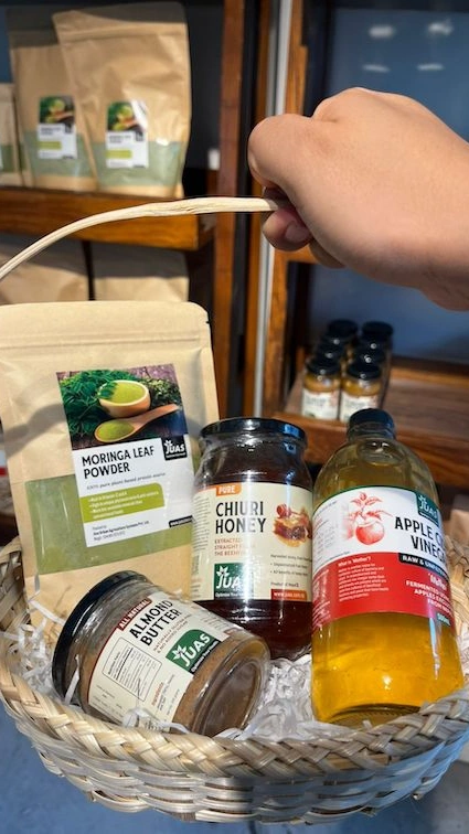 JUAS Moringa leaf powder, Chiuri Honey, Apple cider vinegar, Almond butter in a gift basket.
