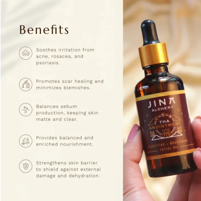 Tha Anointment Facial Oil is a blend of oils that balances skin’s sebum production, controls acne, heals scars, and promotes strong skin barrier. This oil blend is best suited for oily skin. It calms signs of sensitivity caused by a damaged skin barrier such as acne, rosacea, psoriasis, etc. However, it can be used on all skin types after self-experiment.