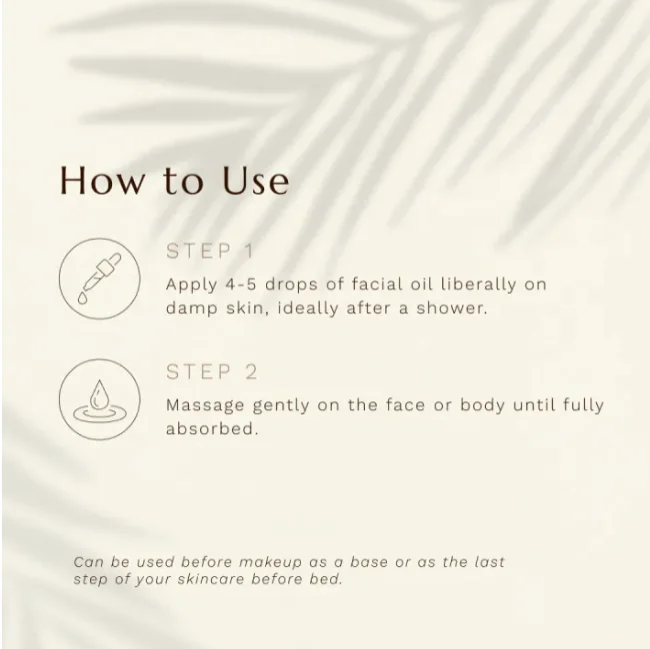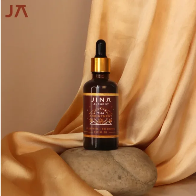 Apply Tha Anointment Facial Oil ideally at the end of a shower when the skin is damp. Apply this concoction before makeup as a base or as a last step of skincare routine (before bed). Gently massage until fully absorbed.